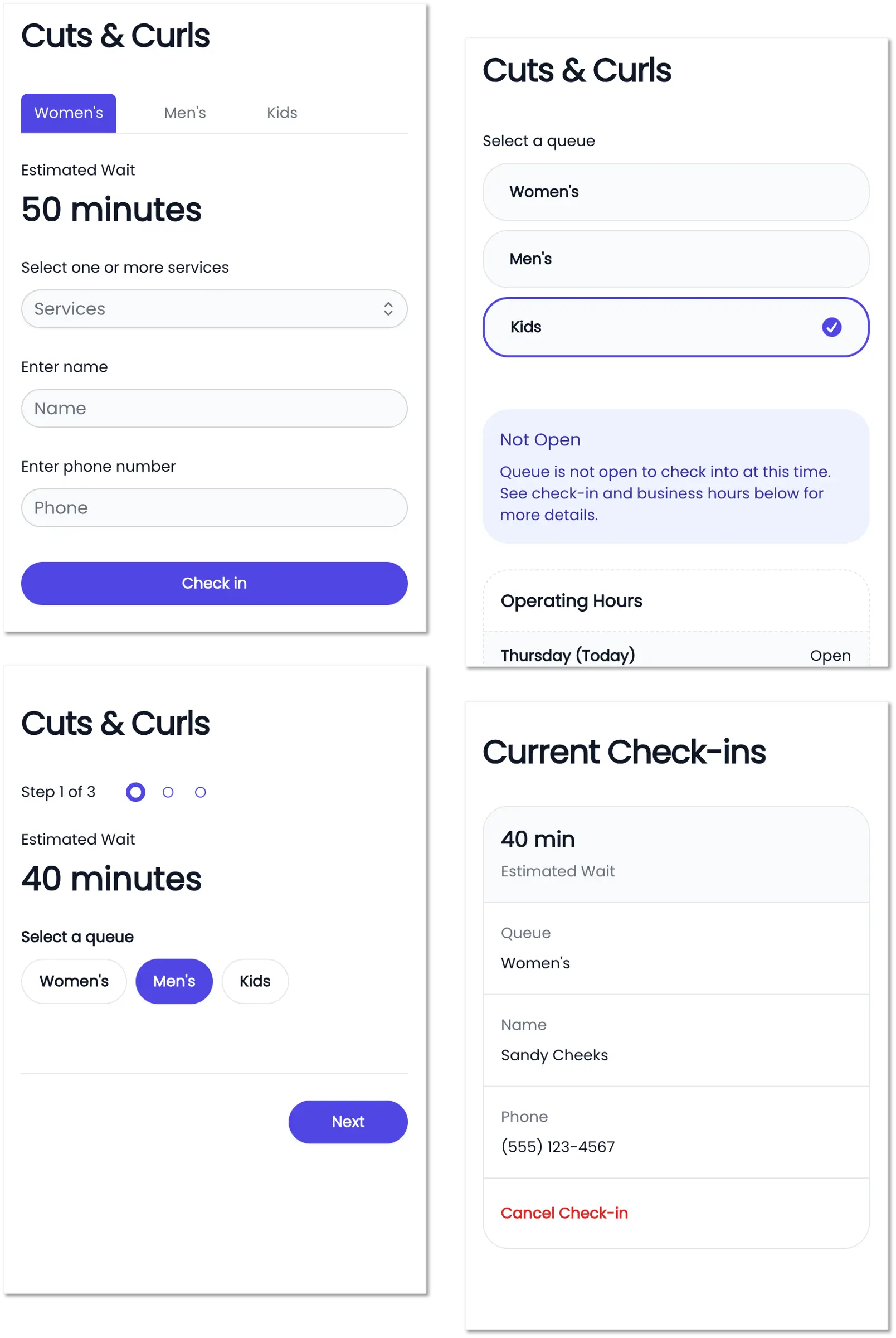 Setup online queues. Enable online check-ins. Show live wait times. Let customers come when its time. Avoid crowding and long waits.